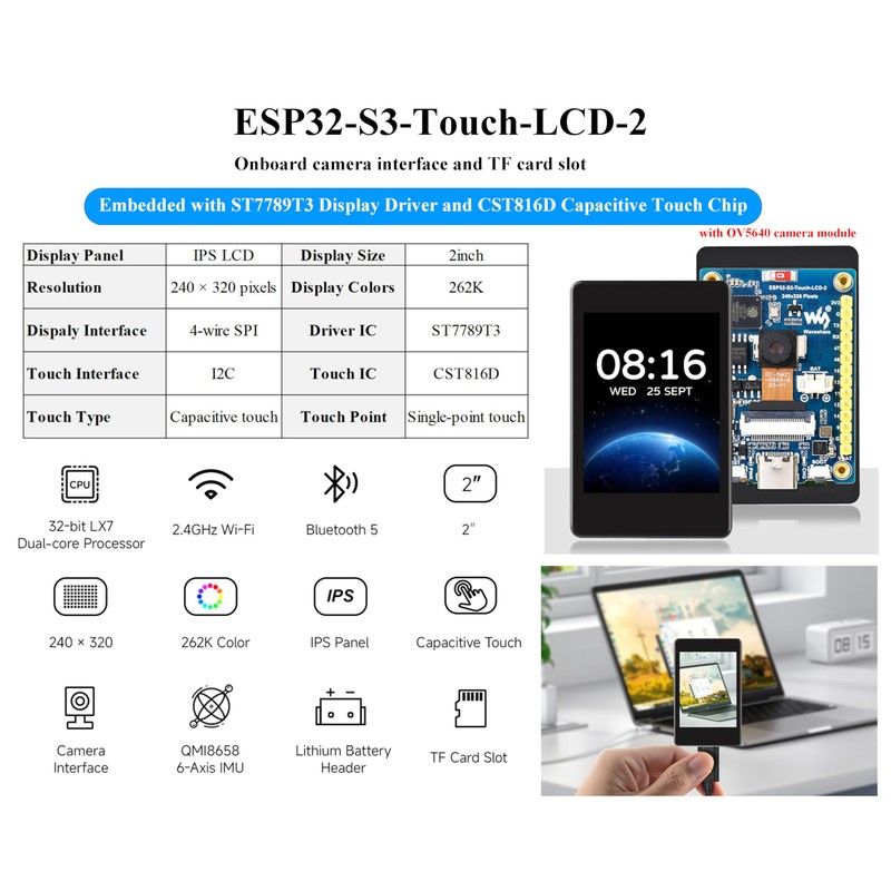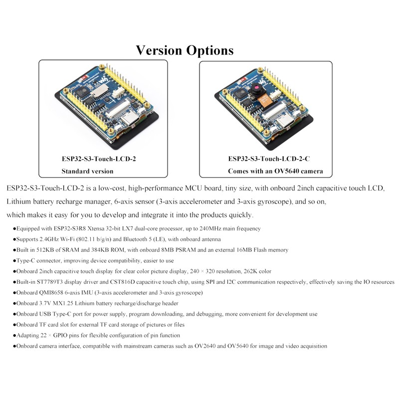 - ESP32-S3 2inch Capacitive Touch Display Development Board, equipped with ESP32-S3R8 Xtensa 32-bit LX7 dual-core processor, up to 240MHz main frequency. Onboard 2inch capacitive touch display for clear color picture display, 240 x 320 resolution, 262K color.