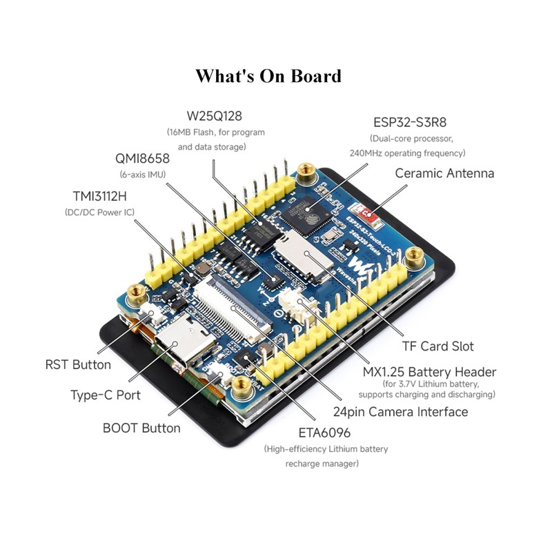 Onboard QMI8658 6-axis IMU (3-axis accelerometer and 3-axis gyroscope).