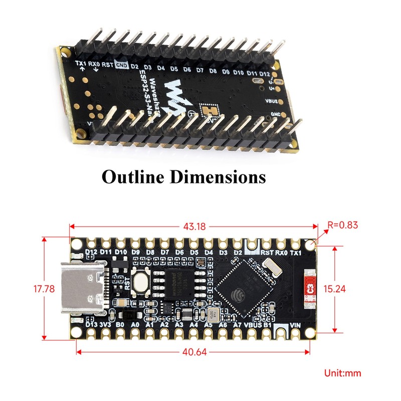 • The ESP32-S3-Nano Development Board with Pre-Soldered Header, adopts ESP32-S3R8 chip and is compatible with Arduino Nano ESP32. It is compact in size and powerful, suitable for applications such as IoT and MicroPython, and easy to integrate into your projects.