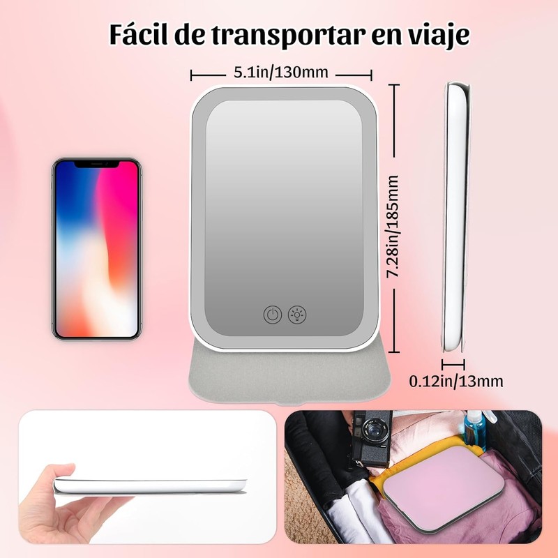 - 【Espejo de viaje portátil】 El tamaño del espejo de maquillaje iluminado recargable y plegable USB es de 183*130*13mm. El espejo de maquillaje LED muy ligero es fácil de transportar y almacenar. Puede poner fácilmente el espejo de luz en su bolsa o equipaje. Es un compañero de viaje perfecto.