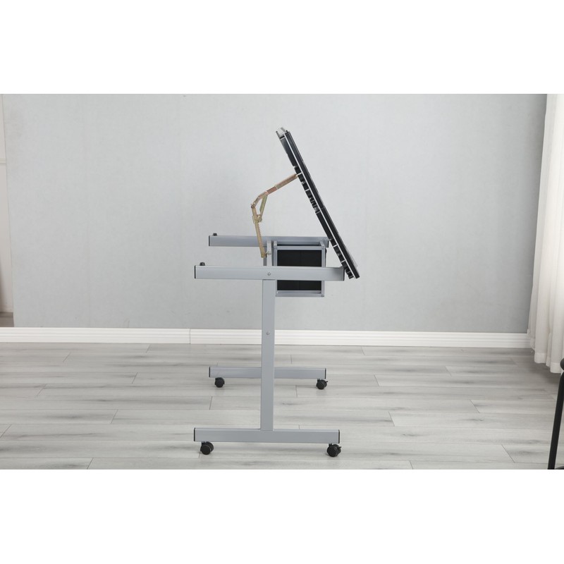 espidoo Adjustable Art Drawing Desk: Glass Top Drafting Table with 2 Fabric Drawers & 4 Wheels - Adjustable 0-70° for Artists & Crafters - Silver Grey Metal Frame & Non-Slip Design