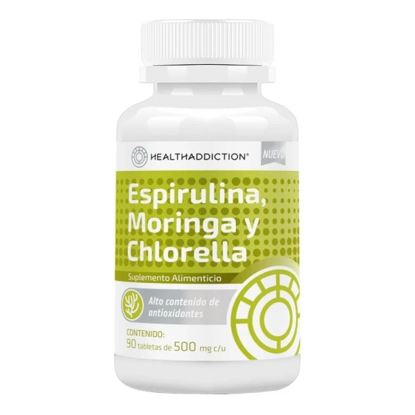 Descubre el poder de nuestro Complejo de Espirulina, Chlorella y Moringa de HEALTHADDICTION, un suplemento alimenticio vegano que combina la fuerza de tres superalimentos en 90 tabletas de 500 mg. Este blend único está diseñado para ofrecerte una concentración excepcional de antioxidantes y nutrientes esenciales que apoyan tu salud y bienestar diario.