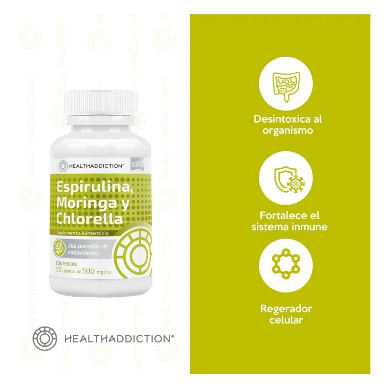Eleva tu bienestar diario con el Complejo de Espirulina, Chlorella y Moringa de HEALTHADDICTION y vive una vida más plena y saludable.