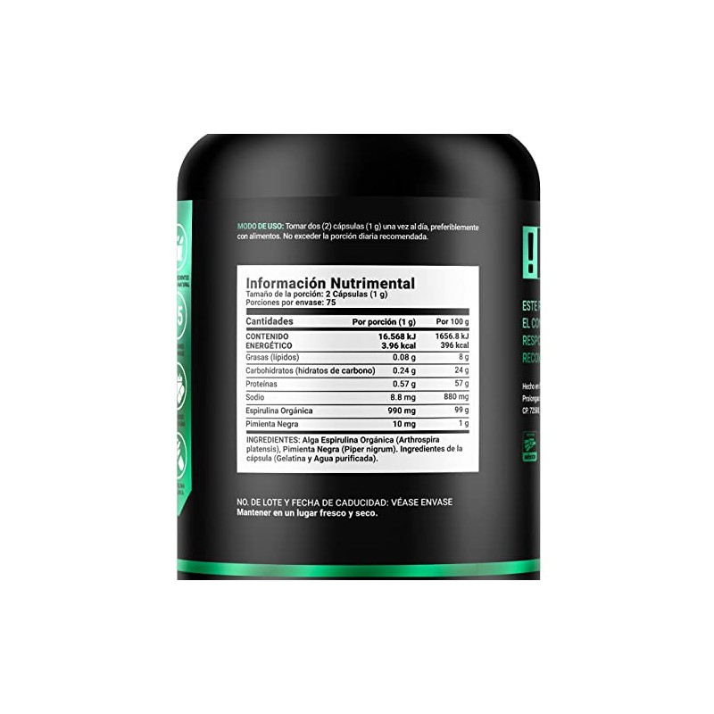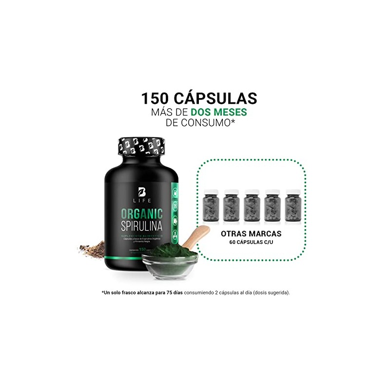 Espirulina Orgnica de 150 Cpsulas 500 mg. Ingredientes naturales Alga Espirulina. Organic Spirulina B Life.