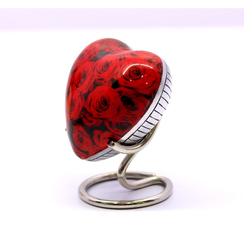 eSplanade Brass Mini Cremation Urn Heart-Shaped Keepsake Memorial Jar Pot Container | Small Urn with Stand for Funeral Ashes Burial | Red Roses Printed Keepsake | Red - 2.75" Inches