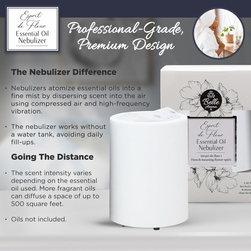 - Advanced Waterless Technology: Experience the pinnacle of aromatherapy with the Belle Aroma Esprit de Fleur Essential Oil Diffuser. Our diffuser uses advanced waterless and heatless nebulizing technology to disperse pure essential oils.