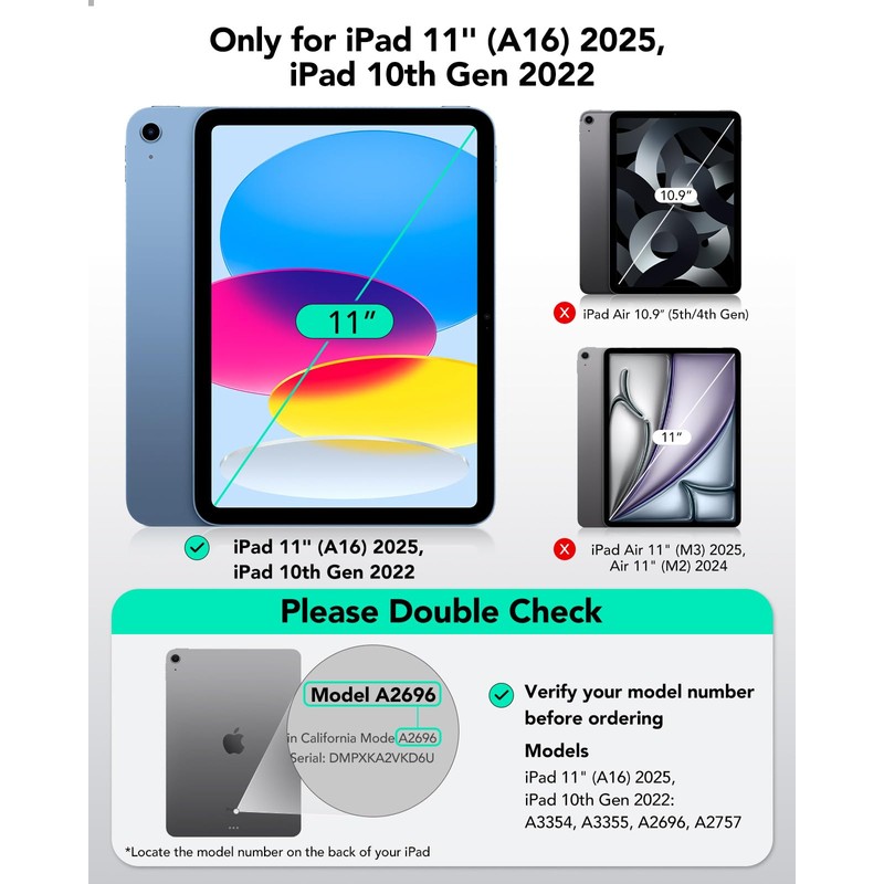 - Compatibility: only for iPad (A16) 11th Generation 2025 and iPad 10th Generation 2022, models: A3354, A3355, A2696, A2757; not compatible with other iPad models; please check the back bottom of your iPad for the model number "AXXXX" to confirm compatibility