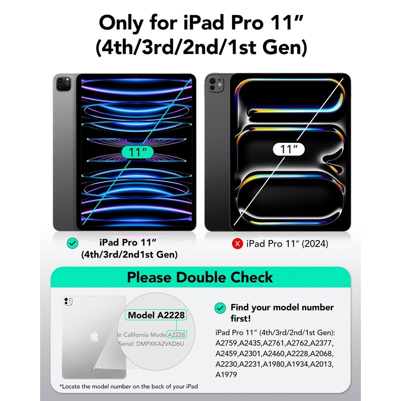 - Compatibility: compatible with iPad Pro 11" 2022 4th Generation (Model: A2759 / A2435 / A2761 / A2762), 2021 3rd Generation (Model: A2377 / A2459 / A2460 / A2301) , also fits iPad Pro 11 2nd Gen 2020 (Model: A2228/ A2068/ A2230 / A2231 ) & iPad Pro 11 Inch 1st Gen 2018 (Model: A1980 / A1934/ A2013 / A1979). Please check back bottom of your iPad to find the model number "Axxxx".