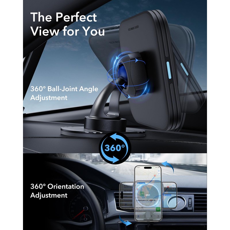 - Secure Magnetic Lock: powerful magnets with 1,400 g of holding force and a non-slip silicone ring keep your phone securely in place, even when driving on bumpy roads; an official MagSafe case or ESR HaloLock case is recommended for rough terrain