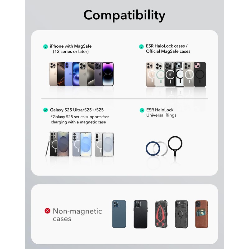 - Compatibility: only for iPhone 16/15/14/13/12 series, Samsung Galaxy S25 Ultra/S25 +/S25 with a magnetic case. Recommended to use with official or ESR magnetic cases. Not compatible with Motorola and Google phones