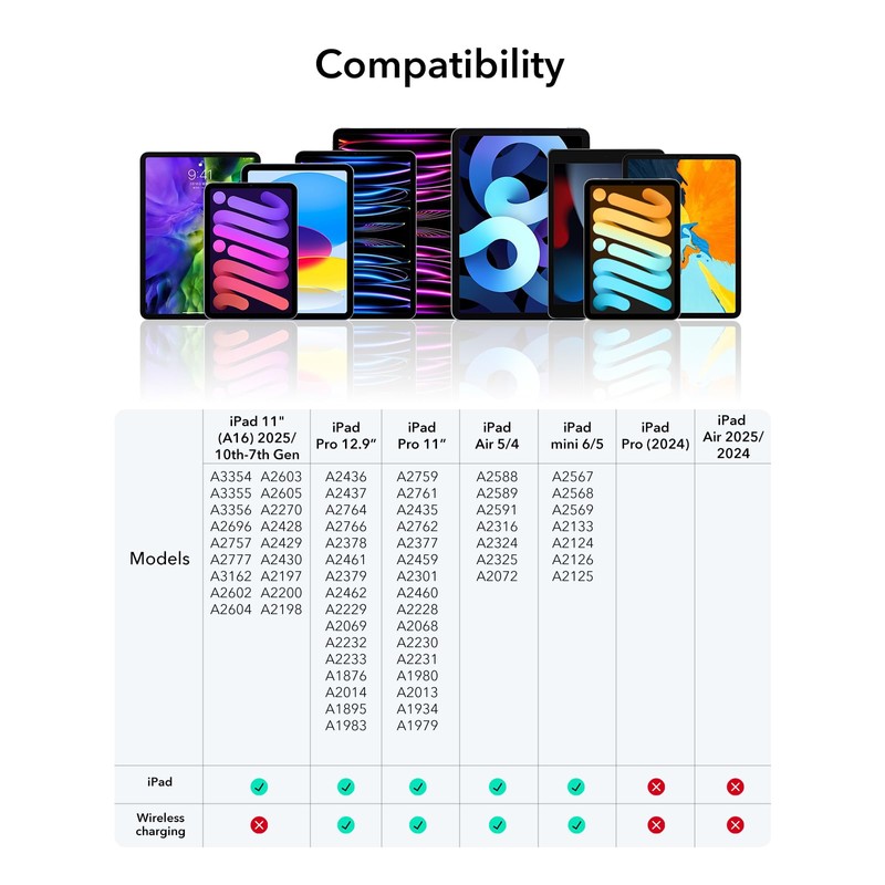 • Compatibility: only for iPad Pro 11", iPad Air 10.9" (5th/4th Gen), iPad Pro 12.9" (6th/5th/4th/3rd Gen), iPad mini (6th/5th Gen), iPad (11th/10th/9th/8th/7th Gen); devices not listed are not supported.
