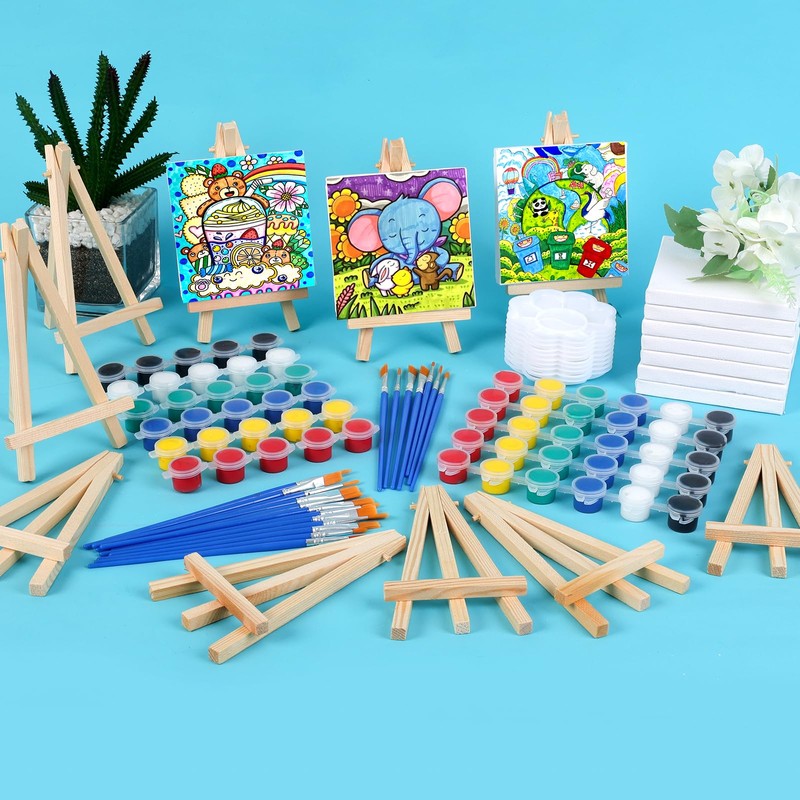 - Mini Easel with Canva: The 10 set mini acrylic paint canvas set provide 4 x 4 inch small stretched canvas with 6 inch mini wood easel. Kids can use these art mini canvas show their creations anywhere. The mini canvas for painting are safe and non-toxic, making them perfect for kids to use. These mini easels are small and sturdy, and can also be used to hold photos, phones and display kid's masterpieces.