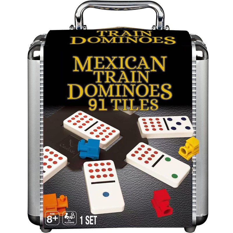 - [ALL IN ONE SET ] Mexican Train dominoes set is a modern version of Dominoes, comes with everything you need to have a good time with family and friends including 91 Classic Double 12 Tiles, 9 Plastic Trains, and a Hub in a Reusable Aluminum Carry Case to make sure you have enough to play with up to 2-9 Players