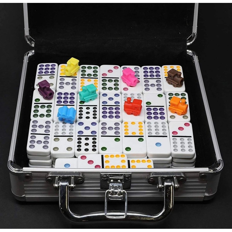 - [Package Including] 1 Featuring Aluminum Case and 91 brightly-colored tiles dot dominoes , 1 instruction booklet , 9 colorful small train, 1 score pad, 1 octagon shape hub.This double 12 Mexican Train Dominoes set comes with everything you need to have a good time with family and friends