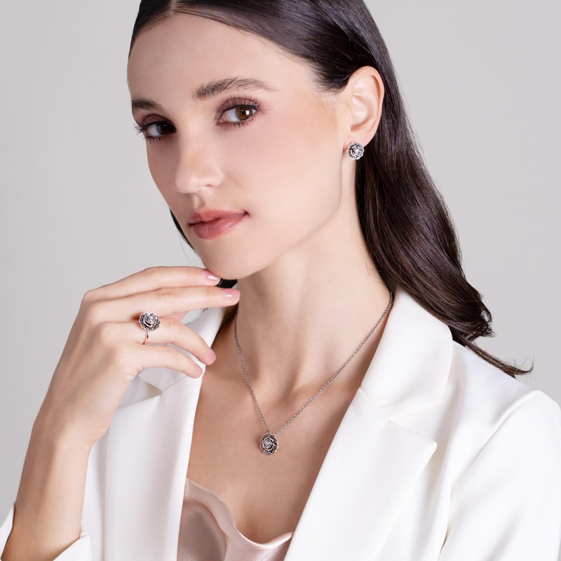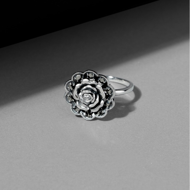 - This lovely sterling silver ring is expertly sculpted into the shape of a delicate vintage rose. The outer petals of the flower are pavé set with sparkling marcasite.