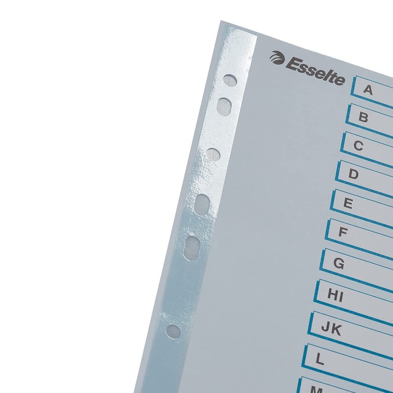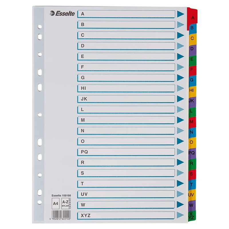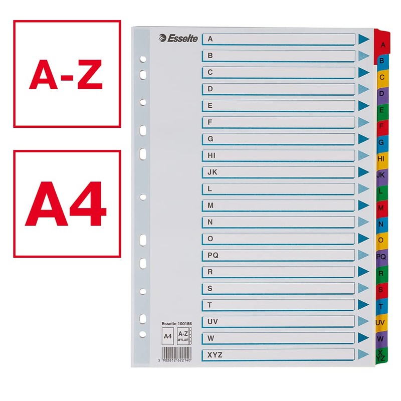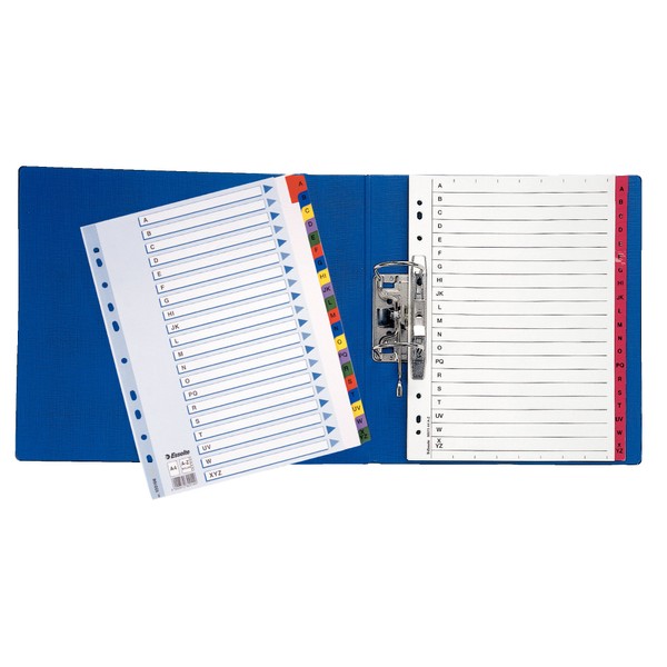 - Contents: One A4 Esselte A-Z index, cardboard, 100166, W x D x H: 22.5 x 0.4 x 29.7 cm; colour - blue/multi-coloured; weight: 0.41 kg