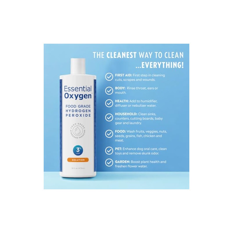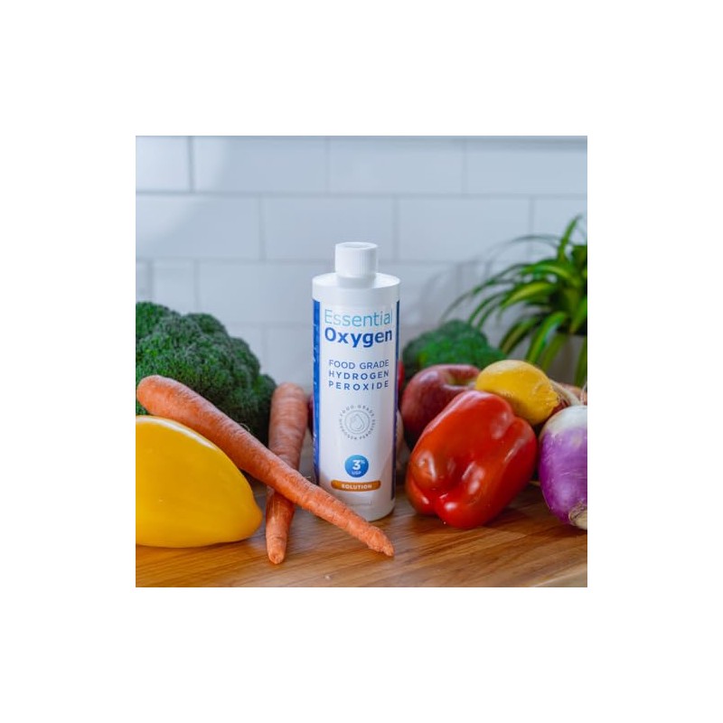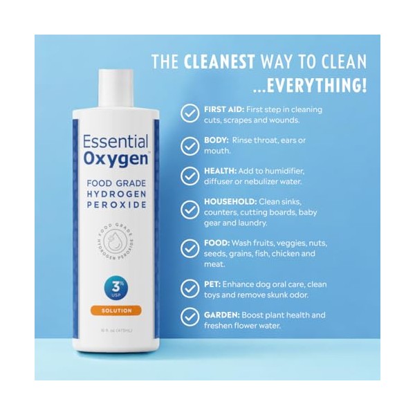 Essential Oxygen Essential Oxygen Food Grade Hydrogen Peroxide, Natural Cleaner, 3% USP, White, 16 Ounce