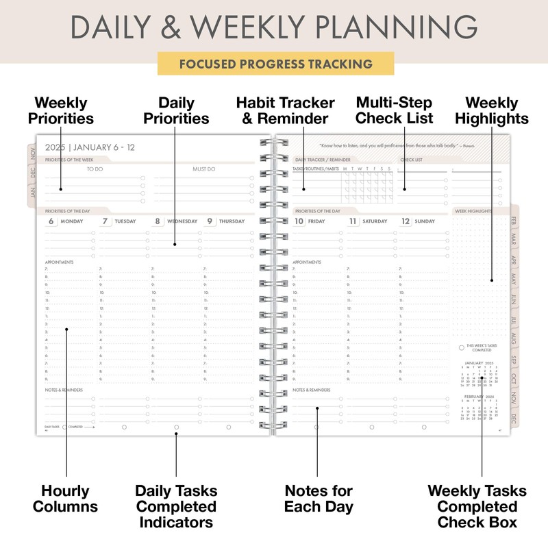 - FLEXIBLE & FOCUSED LAYOUTS - With monthly tabs, daily tracking, and ample notes pages, this planner accommodates unique planning styles while offering the flexibility to prioritize tasks and reflect on achievements.