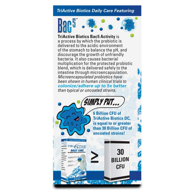 TriActive Biotics Bac5 Activity is a process by which the prebiotic is delivered to the acidic environment of the stomach to balance the pH, and discourage the growth of unfriendly bacteria. It also causes bacterial multiplication for the protected probiotic blend, which is delivered safely to the intestine through microencapsulation. Microencapsulated probiotics have been shown in human clinical trials to colonize/adhere up to 5x better than typical or uncoated strains analyzed in both real and simulated gastric environments, as well as human cross-over fecal recovery studies)