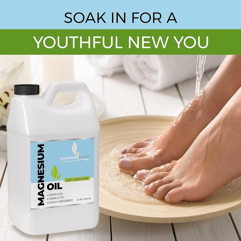 The essentiallybased Magnesium Spray, is a natural solution to support overall wellness and vitality. Sourced from pure magnesium chloride, this topical spray offers a convenient way to replenish magnesium levels in the body. Magnesium plays a crucial role in numerous bodily functions, including muscle relaxation, promoting better sleep, and supporting energy production. Our Magnesium Oil Spray is carefully formulated for optimal absorption, allowing magnesium to penetrate deeply into the skin for maximum benefit. Simply spray onto the skin and massage gently for quick and effective absorption. Experience the rejuvenating effects of magnesium with our Magnesium Oil Spray. Whether you're looking to soothe sore muscles after a workout or support overall health and vitality, our magnesium oil spray for muscle pain is the perfect addition to your daily wellness routine. Our Magnesium oil spray for sleep, formulated with pure magnesium chloride, promotes relaxation and supports natural sleep patterns. Its effects aid in achieving a peaceful slumber when applied before bedtime. Say goodbye to restless nights and wake up refreshed with our natural sleep aid.