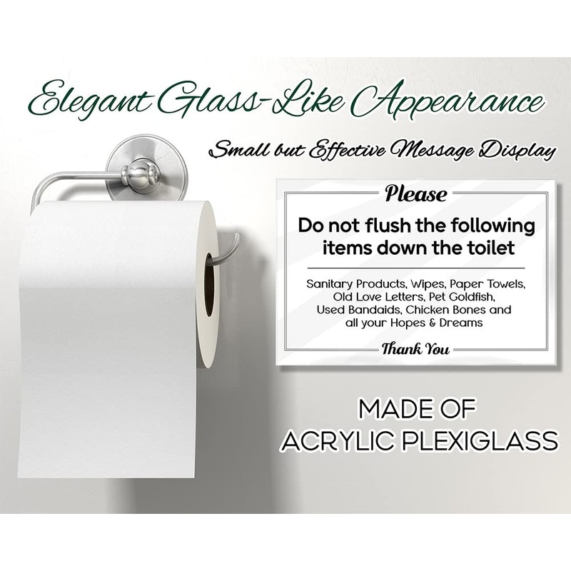 - GREAT QUALITY AND SIZE - Made of high-quality acrylic and measures 4" x 6" inches. It can withstand wet and moist environments and is a great only flush toilet paper sign.
