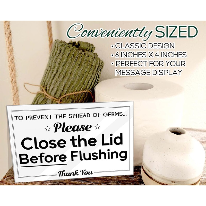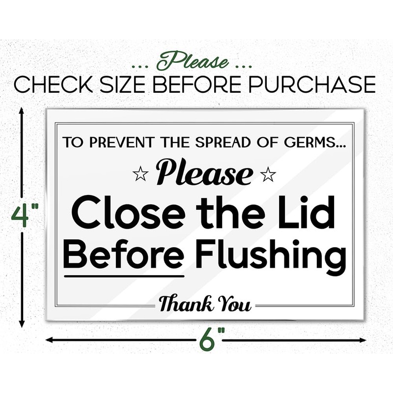 - EFFECTIVE SEPTIC SYSTEM REMINDER - With its clear and easy-to-read design featuring high-resolution waterproof ink, this sign is an effective reminder to close the lid before flushing. Mount it on the wall, lean it against a surface, or place it in a 4"x6" frame to complement your decor.