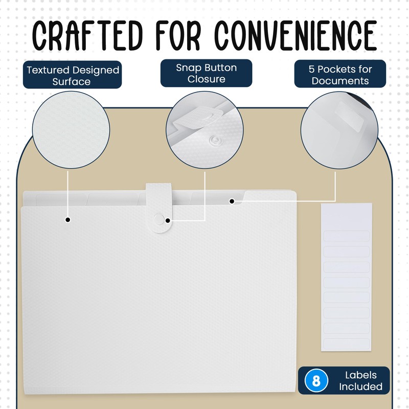 Essex Wares - White, 5 Pocket Expanding File Folder, 9.8" x 13" - 5 Pocket Folder for Documents with Textured Exterior - Expandable File Folder with Snap Closure - Fits 8.5" x 11" Letter Sized Papers