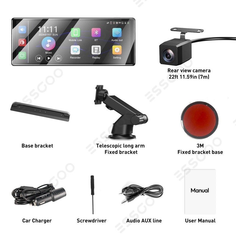 ESSGOO 11.3" HD Wireless Android & Carplay Screen for Car DVR, Portable Touchscreen 4K