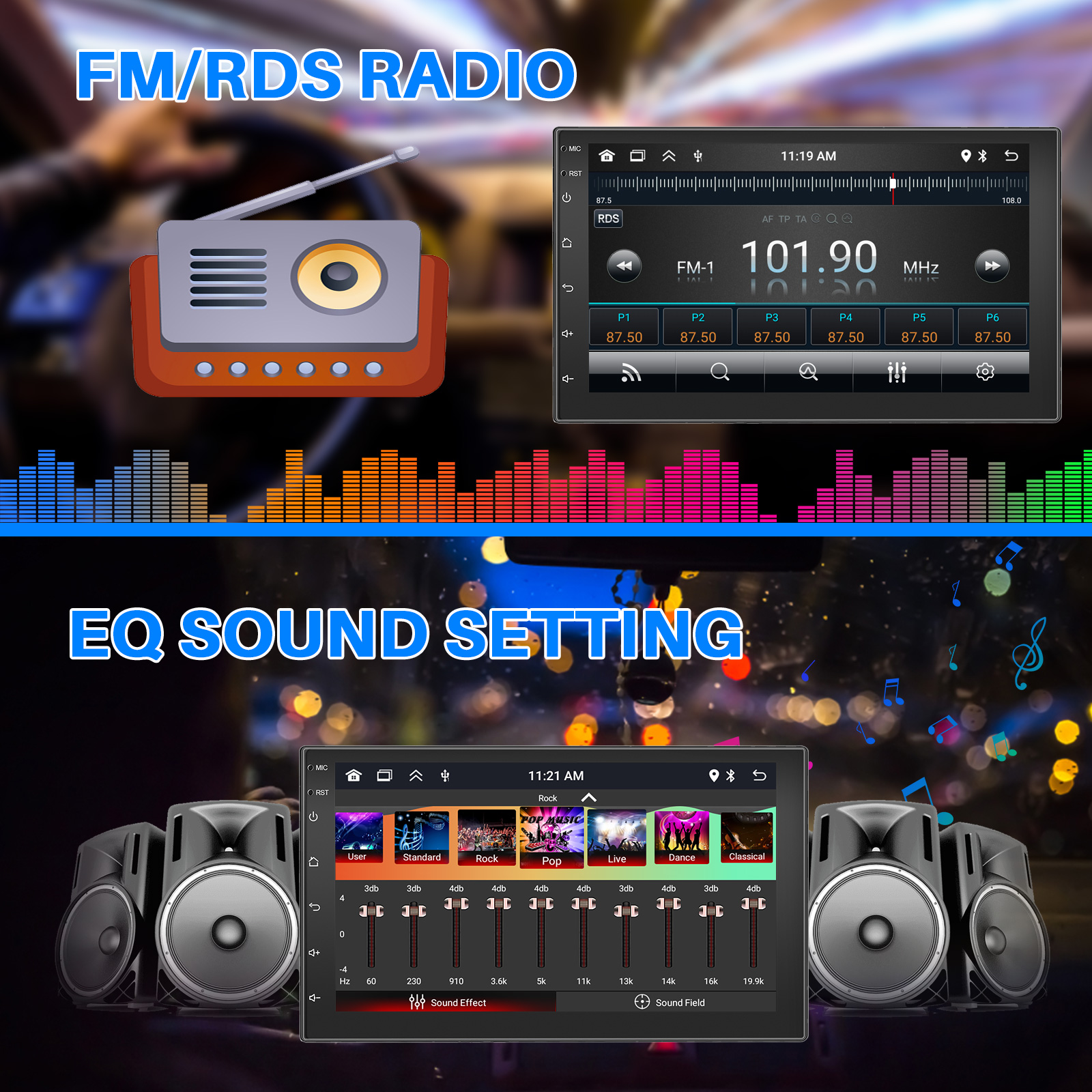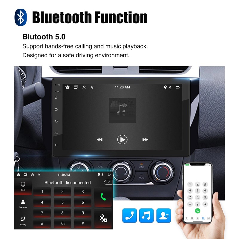 Built-in Bluetooth 5.0 with A2DP, support Bluetooth hands-free calling, phone book call logs download, audio streaming music. Built-in microphone to make your call clearer. FM/RDS radio can preset 18 common stations with high stereo quality, which can fully automatic, semi-automatic and precise channel scanning.