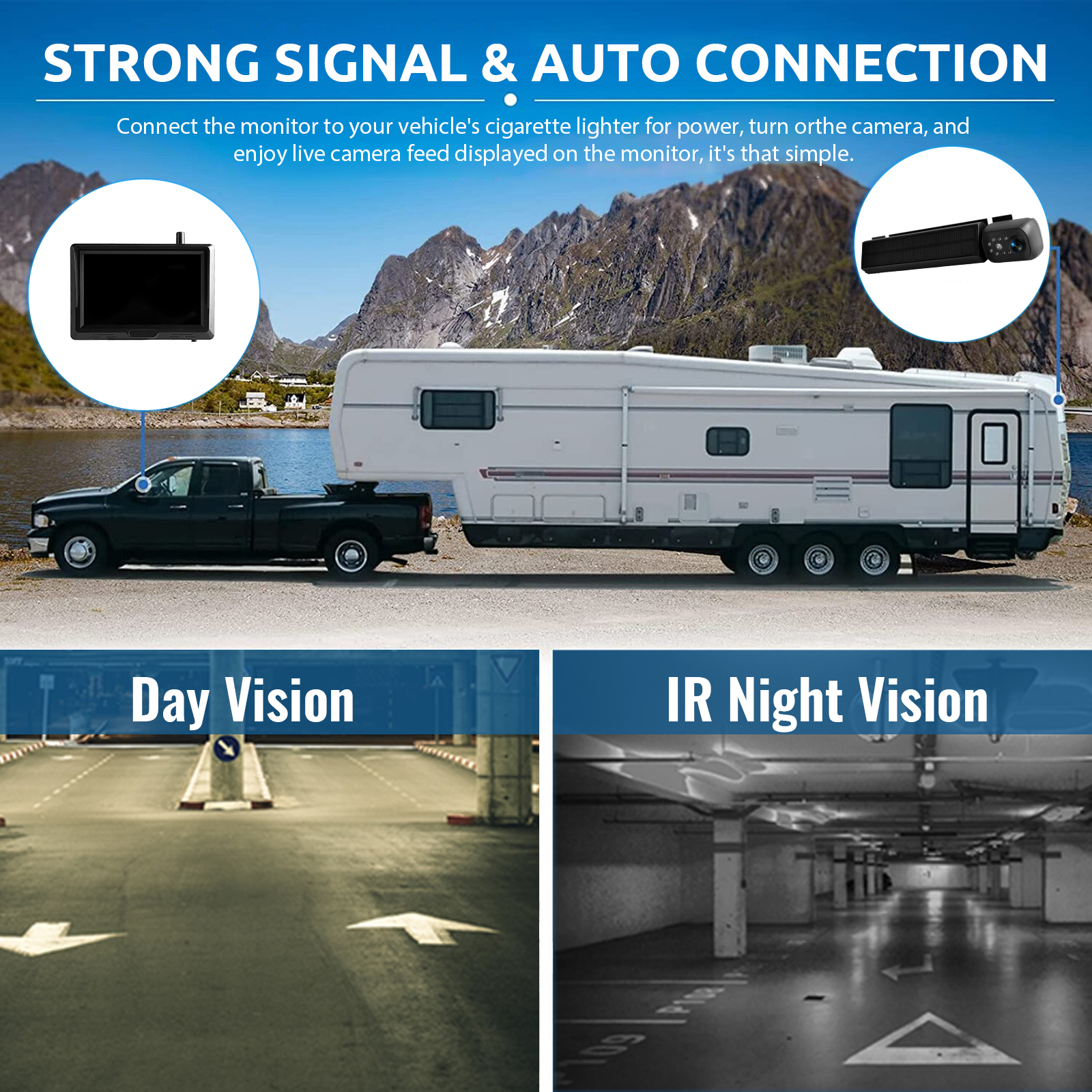 Trailer backup camera with super large HD 5" monitor. The image is super clear and any distortion is reduced to a minimum. Thus, you will get to enjoy a flawless parking and driving experience.