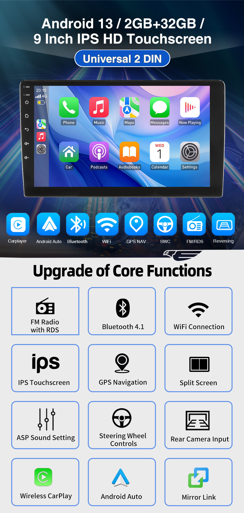 RDS/FM Radio & Bluetooth & ASP Sound: Supports Bluetooth 4.1, with built-in microphone so you can make hands-free calls while driving. Support access to phone book, music playback interface, etc. RDS supported. You can save 18 FM radio stations. Integrated ASP sound setting. Supports 32-band EQ adjustment, which can be adjusted according to your personal preferences. Which is very similar to your original sound. 4 x 45W amplifier, surround sound and subwoofer output.