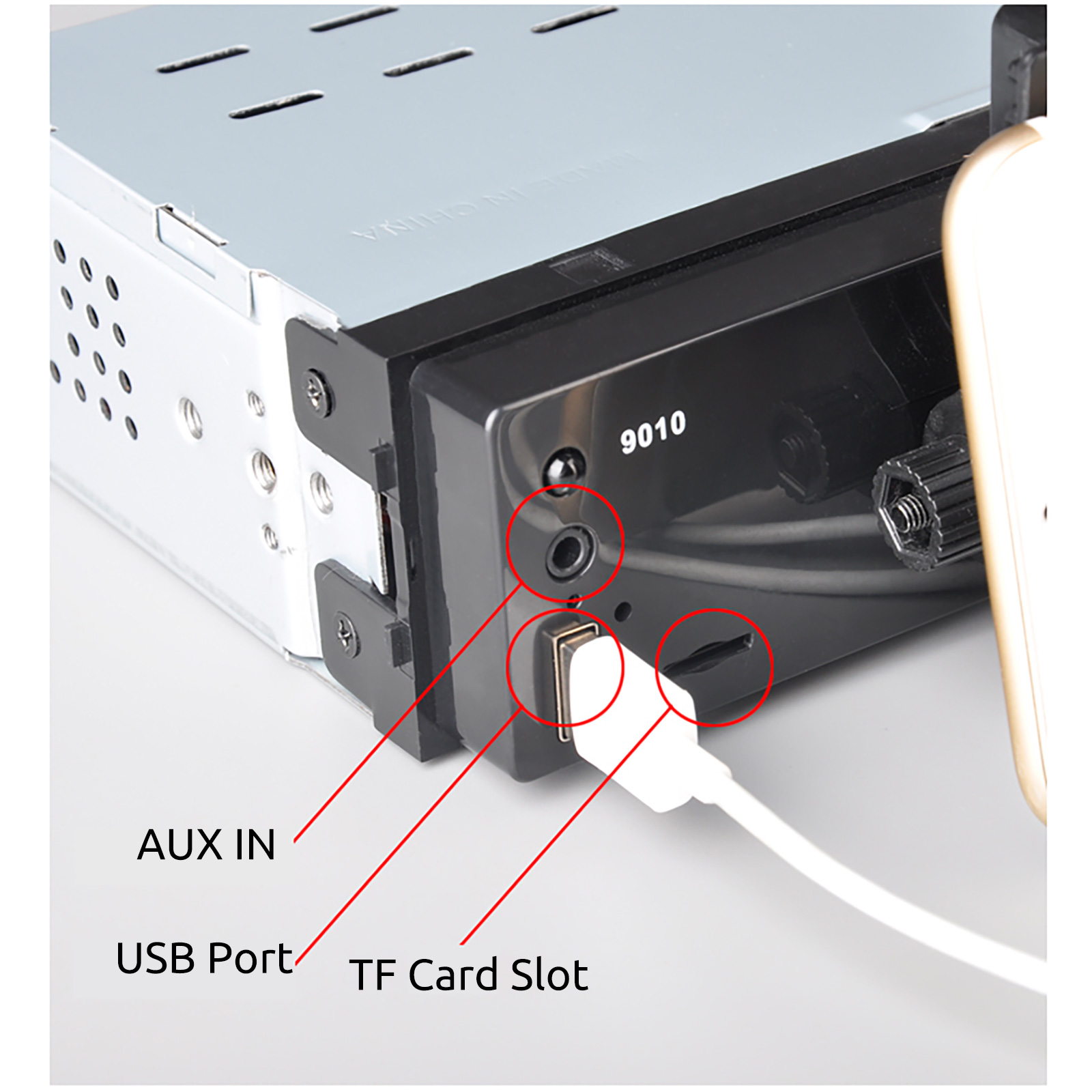 【Multiple Input Way】 USB /SD/AUX input. this 1 din car stereo support vast USB/SD storage equipment, you can download the songs and videos you like into the storage equipment to play. AUX audio input,support external aux(3.5mm plug) to input into the audio, such as navigation, MP3, MP5, mobile phone audio ect, input through the front terminal AUX audio, output sound from the car's high powers horn. Charging function, USB interfaces are support of most tranches of cellphones's charging, no worries about having no power during driving