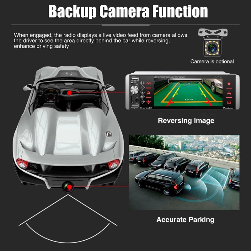 【1 DIN Car Radio】5.1 inch 2.5D IPS HD capacitive touch screen, touch display area, touch button area, sensitive operation. Fully compatible with current mainstream video formats, supports HD picture quality, front channel output perfectly restores sound quality and improves sound performance. This single din car stereo installation size: 188(L)*50(H)mm.