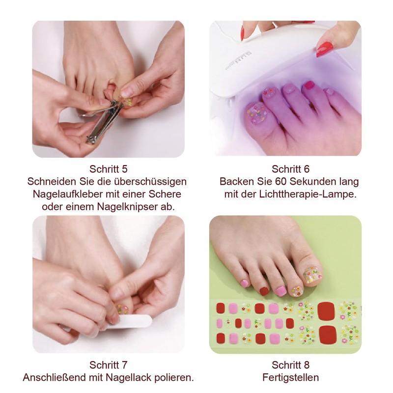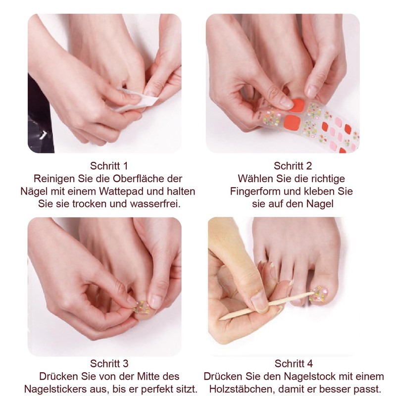 - Sichere und Ungiftige Materialien: Unsere Gel-Pedikürestreifen bestehen aus echtem Gel-Nagellack, sind voll und glänzend, passen perfekt auf die Nägel, sind ungiftig, nicht reizend und verletzen die Nägel nicht. Im Vergleich zu gewöhnlichen Nagelaufklebern bilden sie keine Blasen oder Risse, passen sich natürlich der Nageloberfläche an und fühlen sich so angenehm an wie natürliche Nägel