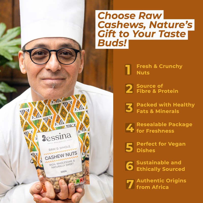 - ✨ 𝗙𝗿𝗲𝘀𝗵𝗻𝗲𝘀𝘀 𝗚𝘂𝗮𝗿𝗮𝗻𝘁𝗲𝗲𝗱: We take pride in delivering the freshest cashew nuts to your doorstep. Each bite is a delightful combination of quality, taste, and nutritional goodness. Experience the essence of African cashews with Essina Wholefoods!