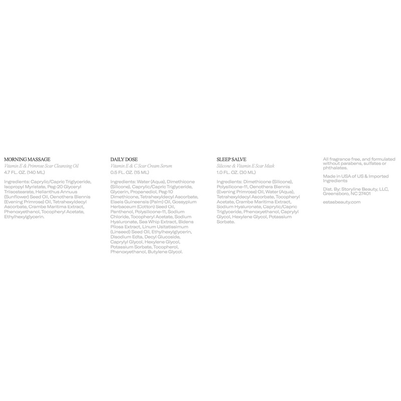 - Comprehensive Scar Care: This ESTAS Beauty Scar Treatment Routine is a meticulously curated 3-product kit designed to effectively target and improve the appearance of both old and new scars. Ideal for various types of scars including those from surgeries, burns, C-sections, and acne.