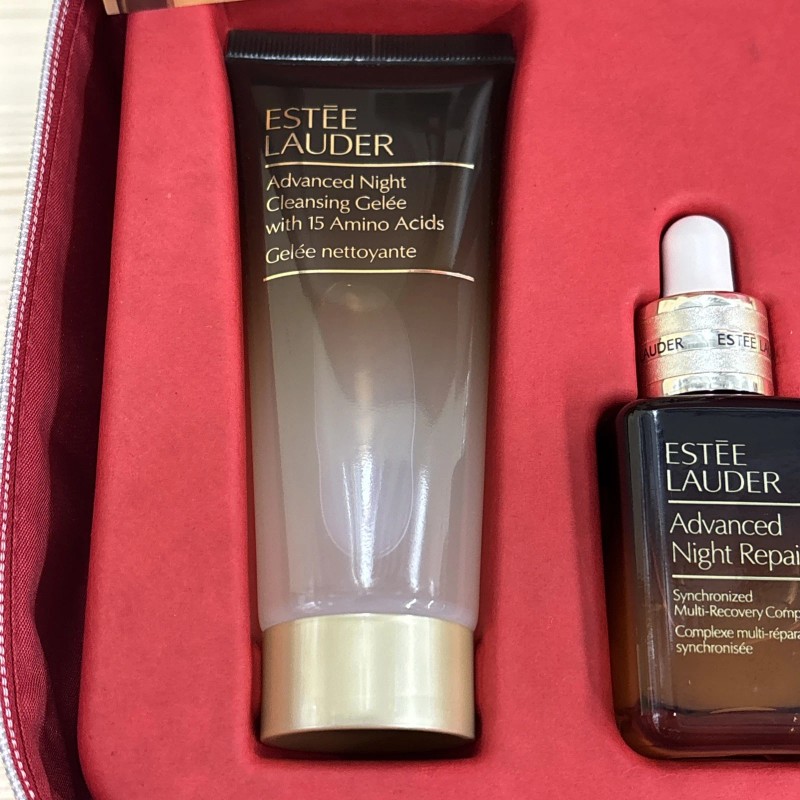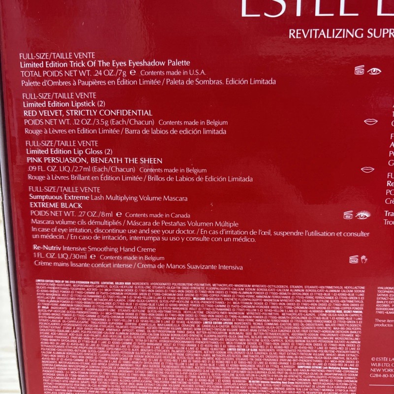 - Set Includes: Estee Lauder - Advanced Night Cleansing Gelee with 15 Amino Acids, Advanced Night Repair - Synchronized Multi-Recovery Complex, Estee Lauder Re-Nutriv - Intensive Smoothing Hand Creme, Advanced Night Repair Eye Supercharged Gel-Creme Multi-Recovery, Estee Lauder - Revitalizing Supreme+ Youth Power Creme, Estee Lauder - Limited Edition Trick Of the eyes Eyeshadow Palett, Eyeshadow Palette Colors - Levitating,Wildcard,Golden Hour, Eyeshadow Palette Colors - Intuitive,Secret Powers,Et Voilai, Limited Edition Lipstick - Strictly Confidential, Limited Edition Lipstick - Red Velvet, Sumptuous Extreme - Lash Multiplying Volume Mascara, Limited Edition Lip Gloss - Beneath The Sheen, Limited Edition Lip Gloss - Pink Persuasion