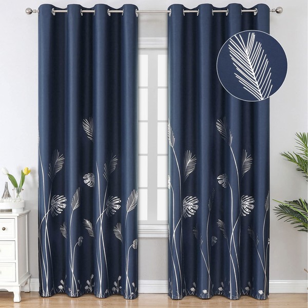 Estelar Textiler Blackout Curtains Grommet 96 Inches Long Elegant Silver Palm Tree Light Blocking Curtains for Dining Room, Navy Blue, 52Wx96L, 2 Panels