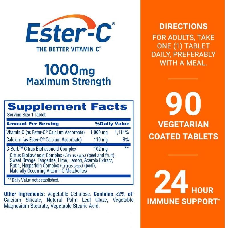 • Ester-C 1000mg tablets provide the immune support you can count on all day, every day* A daily dose of Ester-C tablets gets absorbed into your white blood cells and stays there, for up to 24 hours, which is longer than regular Vitamin C supplements*