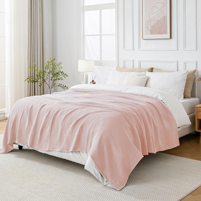 Esterra Muslin Blanket Twin Size Cozy Soft Lightweight Pre-Washed Cotton Blanket, All Season Breathable 4-Layer Gauze Blanket Throw for Couch Bed, Light Pink, 66x90 Inches