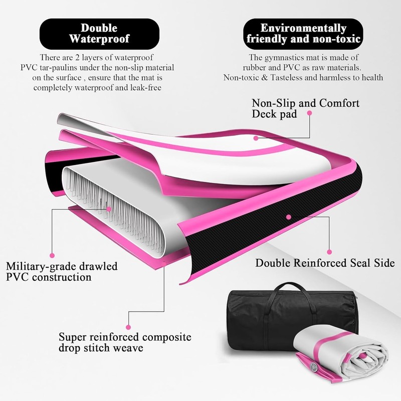 - 【PROFESSIONAL MATERIALS】Estgora Inflatable Gymnastics Mat is made of professional PVC tarpaulin and all seams are double reinforced for superior tear resistance and durability. The surface of the tumbling mat is designed to be non-slip to ensure safe exercise.