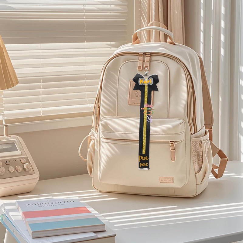 • Glittery Design: Designed as a cheerleader bow keychain, it features a sparkling glitter gold ribbon, rhinestone accents, and a bold "Pin Me" message for eye-catching flair
