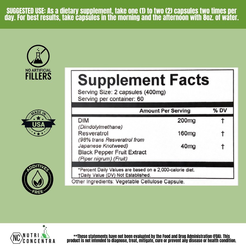 - Supports Hormonal Balance: Contains herbs and nutrients like DIM, resveratrol, and black pepper that work together to promote healthy estrogen metabolism and hormonal balance in the body.