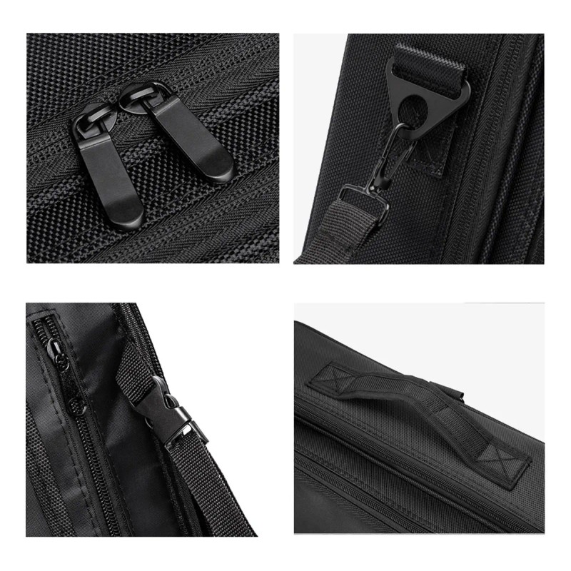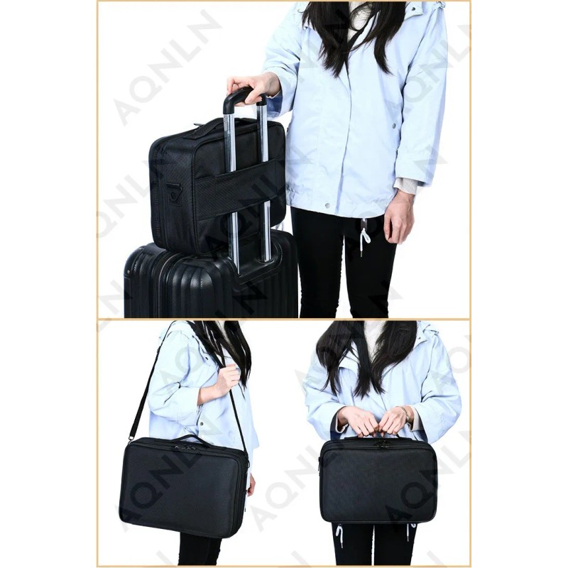 Equipada con un asa duradera, se puede utilizar como bolso de mano. Con una correa de hombro ajustable, se puede utilizar como bandolera. Tamaño exquisito y compacto, se puede guardar fácilmente en la maleta. La parte posterior del estuche de maquillaje está diseñada con una estructura de cinturón fija que permite conectarlo a la funda con carrito.
