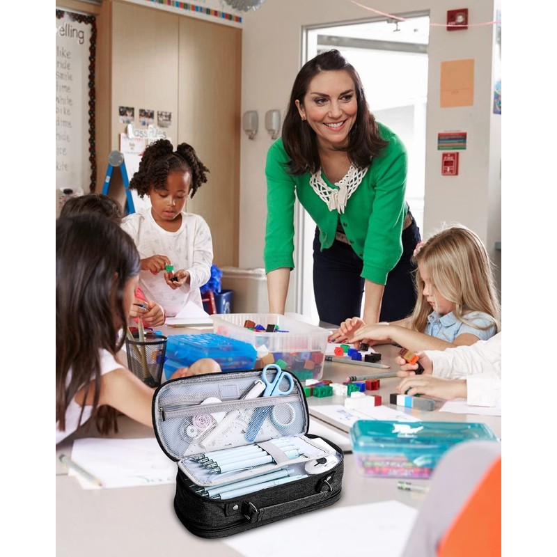 - Clasificación inteligente: Con el bolsillo de malla con cremallera, podrás guardar pequeños artículos de papelería como gomas de borrar, pegatinas, etc. Los bolígrafos de uso frecuente tienen su propio compartimento, y el bolsillo de malla evita que se muevan. Además, hay espacio inferior para guardar bolígrafos, lápices, marcadores, gomas de borrar, tijeras, clips, reglas, calculadoras, barras de pegamento, juegos de geometría y otros elementos esenciales para el aula.