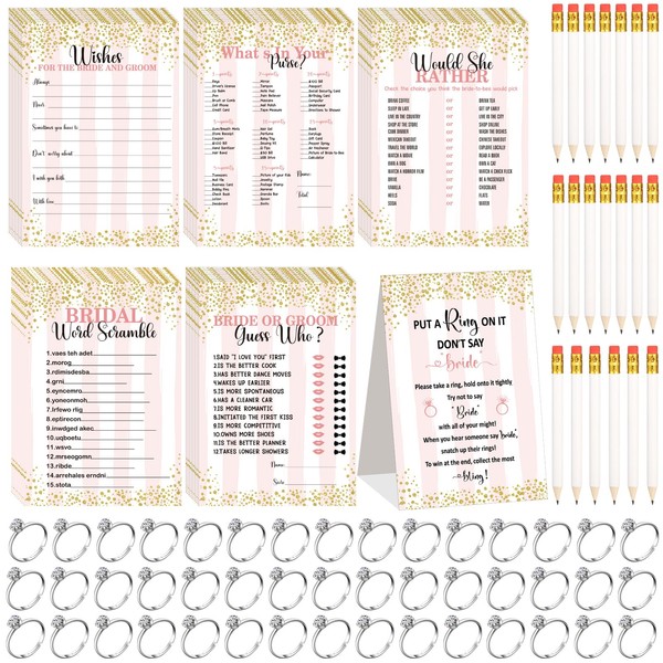 - Funny Bridal Shower Games: you will be provided with 250 pieces of gold confetti themed wedding games cards, 1 piece of wedding sign, 60 pieces of rings and 20 pieces of pencils, sufficient quantities can entertain your families and guests in bridal shower