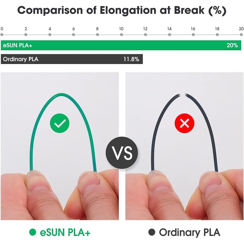 - 【Dimensional Tolerance +/- 0.03mm】eSUN PLA+ 3D printer filaments are produced with more precise specification. Minimum tolerance and low warping to ensure consistent feeding and stable prints, no bubbles, less stringing, extremely high successful rate.