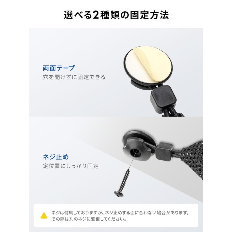 You can choose between 2 types of fixing methods, double-sided tape and screw fastening.