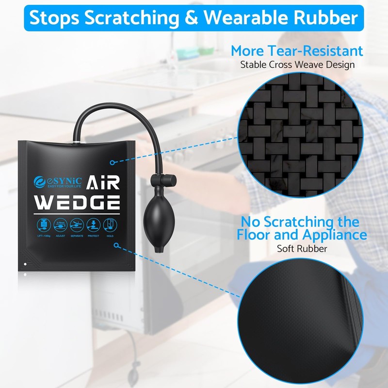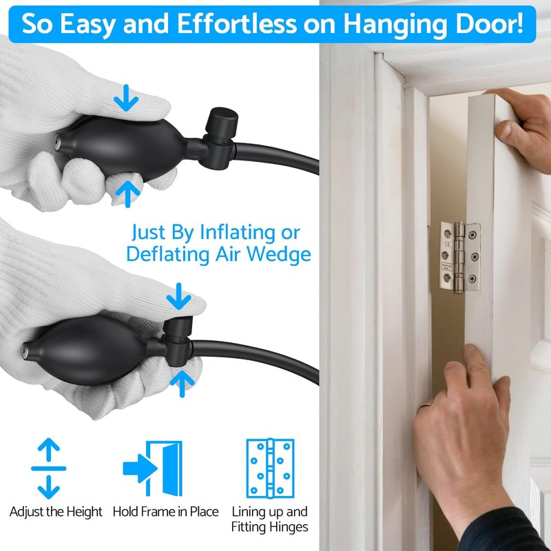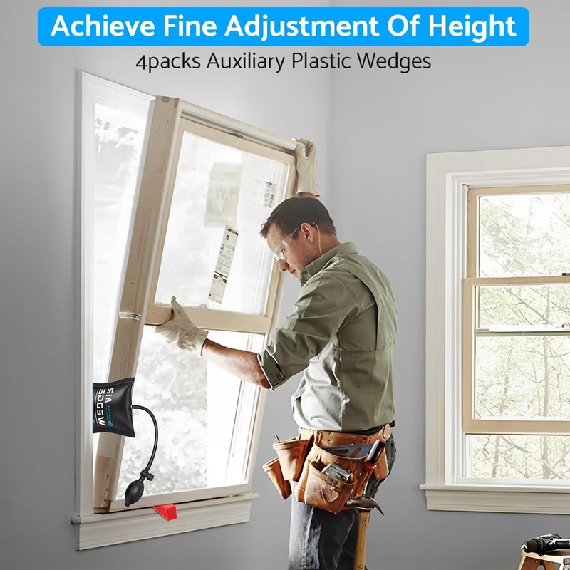 - Inflatable air wedge for installing windows, doors and cabinets, replaces lever bars and damages wood thicknesses.