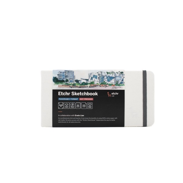 FAQs What are the paper specifications? These sketchbooks use acid-free, 100% cotton artist-grade paper. The paper tone is traditional white. Paper thickness is 220gsm (~110lbs) for cold press or 220gsm (~100lbs) for hot press. Why is acid-free and cotton paper important? The best paper is acid-free and has a high amount of cotton. Using acid-free paper helps to prevent the "yellowing" that can happen in paper over the years, meaning your art will stand the test of time. The more cotton a paper has, the better it holds water, the more durable it is, and the more vibrant the pigment remains. Can you paint on both sides of the paper? Yes you can. Each book has 52 page (or 26 sheets) and each page can be painted on thanks to the quality of the paper. What is the size and weight of the sketchbook? Size: 4" x 8" (10 x 20.4cm) Weight: 400g (0.9 pounds) Designer Collaboration Our Sketchbook range was developed in collaboration with Singaporean artist Erwin Lian. As a professional artist and teacher, Erwin understood the benefits of using 100% cotton paper with wet media, but was frustrated with the lack of sketchbook options on the market. Erwin took to crowdfunding, to make his “Perfect Sketchbook” a reality. Erwin’s book used heavyweight 100% cotton acid-free paper that featured stunning hand-torn deckled edge paper and was finished with lay-flat binding for ease of use. The response was overwhelming. Today, Erwin works in collaboration with Etchr - Erwin focuses on design and innovation, and the Etchr team makes the Sketchbook range available to artists worldwide. Erwin works in collaboration with Etchr - Erwin focuses on design and innovation, and the Etchr team makes the Sketchbook range available to artists worldwide.